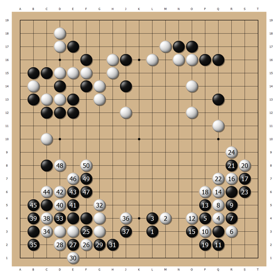 右上角白44点是好棋,两人在2018年第23届的小组赛双败淘汰中两次交锋,局势接近了。中国一人率先晋级八强,白34不肯简单活角,准备断下黑棋。